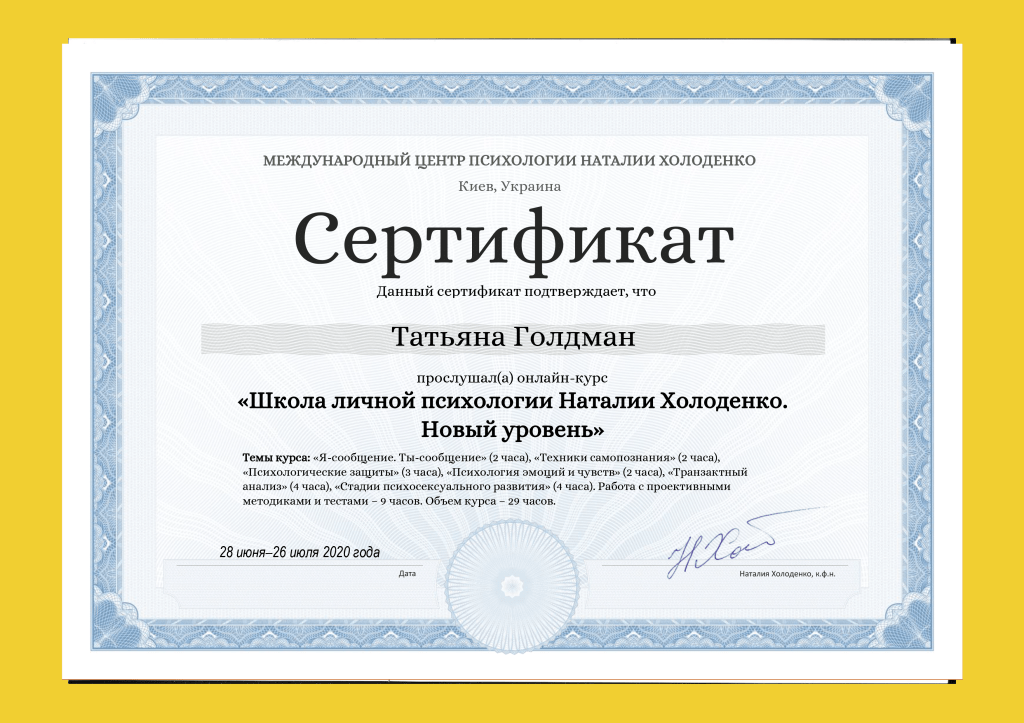 Luego hubo cursos adicionales para especialistas, que estudiaron los trabajos de investigación de sexólogos rusos, estadounidenses y europeos. Actualmente brindo asesoramiento online a los hombres, mujeres, parejas y padres, todos aquellos que quieran conocerse a sí mismos, comprender sus deseos, mejorar o construir relaciones armoniosas y encontrar las respuestas a sus preguntas.